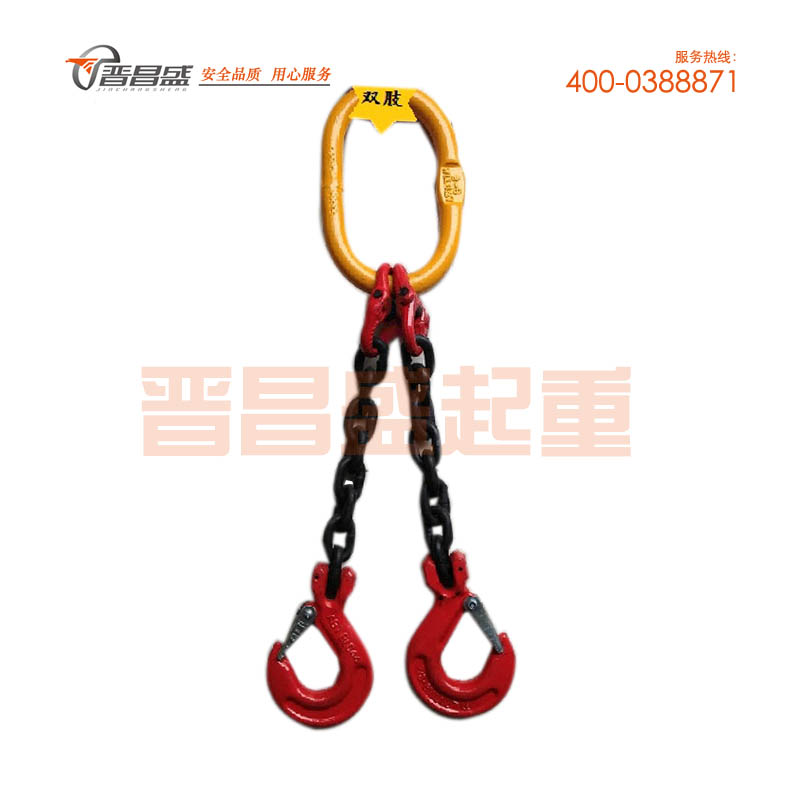 1、該索具可以作為單肢捆綁索具使用,當(dāng)單肢捆綁索具使用時只需將吊鉤鉤入鏈條,此時額定載荷將降低20%。