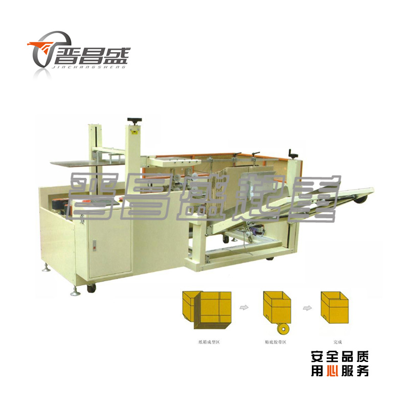 自動完成開箱、成形、下底折葉折曲。并現(xiàn)時完成下部分膠帶粘貼,將疊成紙板的箱板自動打開,箱子底部按一定程序折合,并用膠帶密封后輸送給裝箱機(jī)的專用設(shè)備。