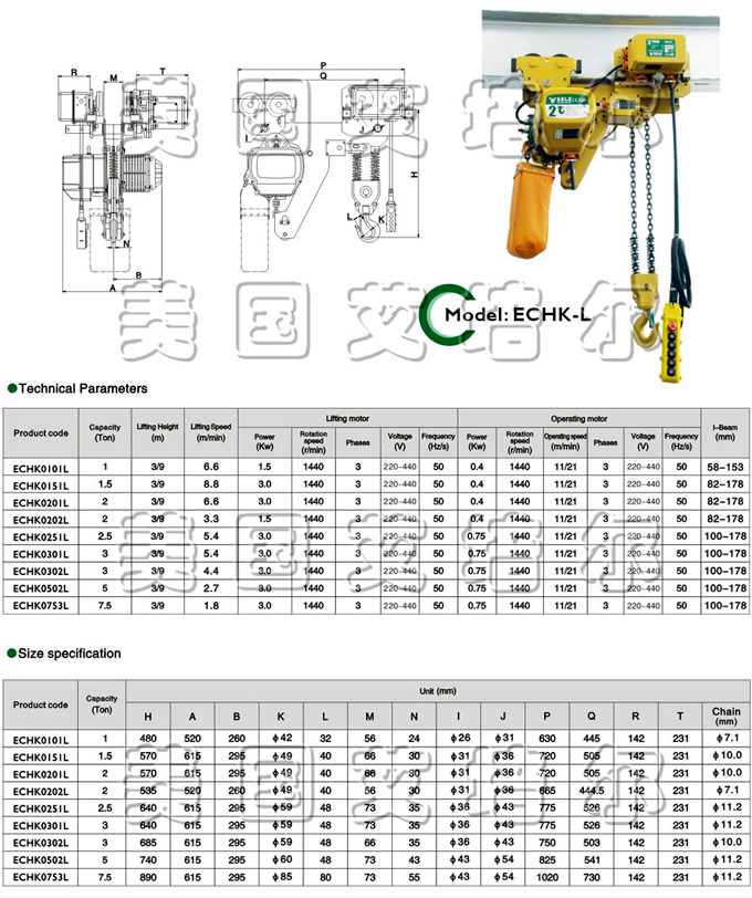 美國艾培爾環(huán)鏈電動(dòng)葫蘆產(chǎn)品介紹: 電動(dòng)葫蘆具有結(jié)構(gòu)緊湊、自重輕、體積小、操作方便、易于維護(hù)等特點(diǎn)。電動(dòng)葫蘆既可以單獨(dú)安裝在架空工字梁上,也可以配套安裝在電動(dòng)或手動(dòng)單梁、雙梁、懸臂、龍門等起重機(jī)上。 因此,它是工廠、礦山、港口、倉庫、貨場、商店等常用的起重設(shè)備之一,是提高勞動(dòng)效率,改善勞動(dòng)條件的必備機(jī)械。